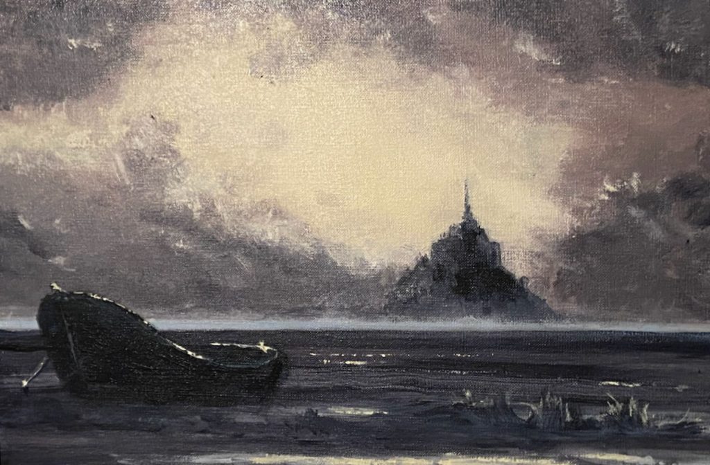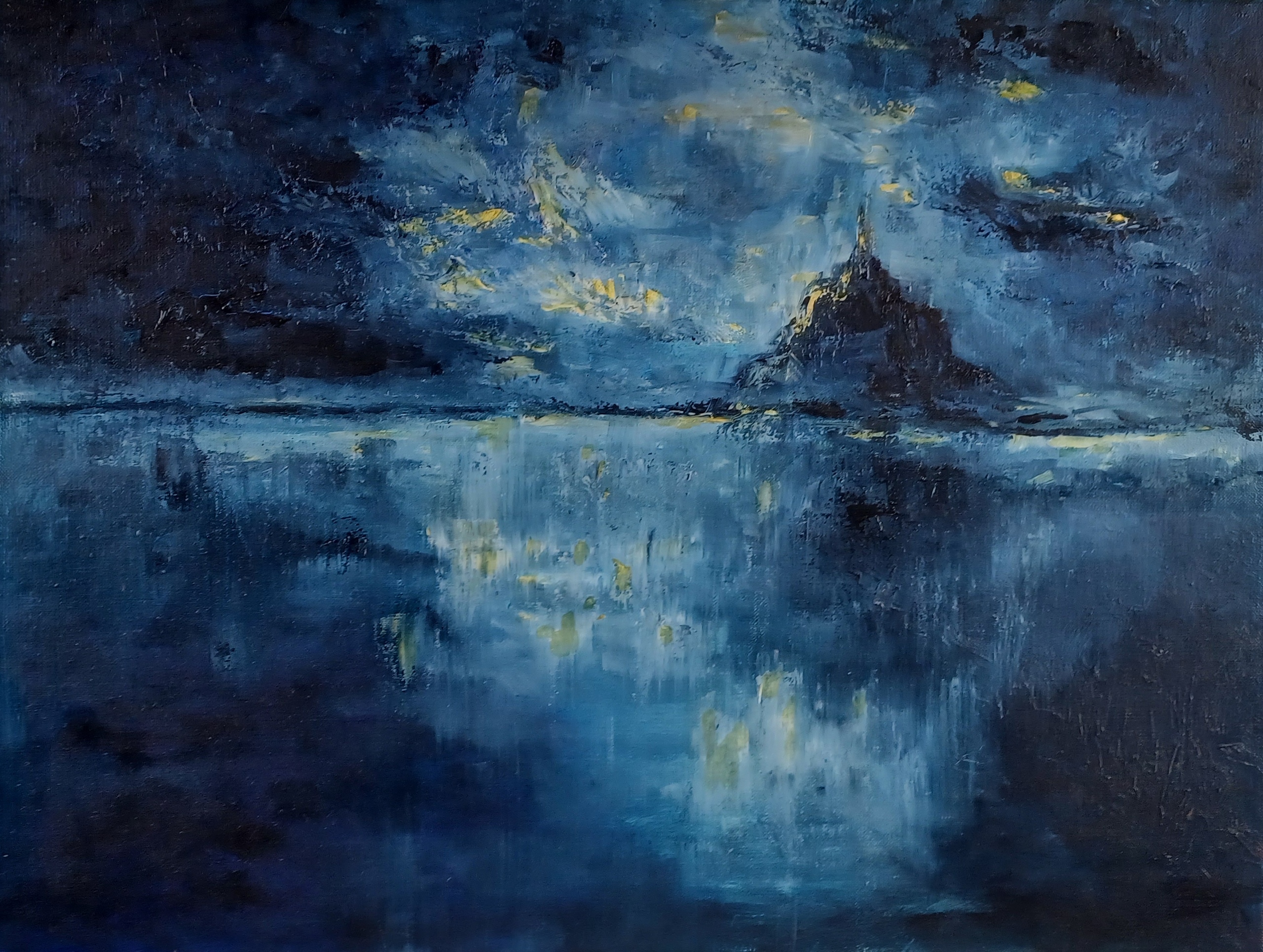 Cette barque invite à traverser les ténèbres d’où apparaît le Mont emprunt de mysticisme, toutes ses légendes viennent m’interpeller. Cette lumière blanche nimbant le Mont est là figurant le Bien combattant l’obscurantisme, toute la symbolique de Saint Michel dans ce tableau que je regarde les jours gris. Encore merci.